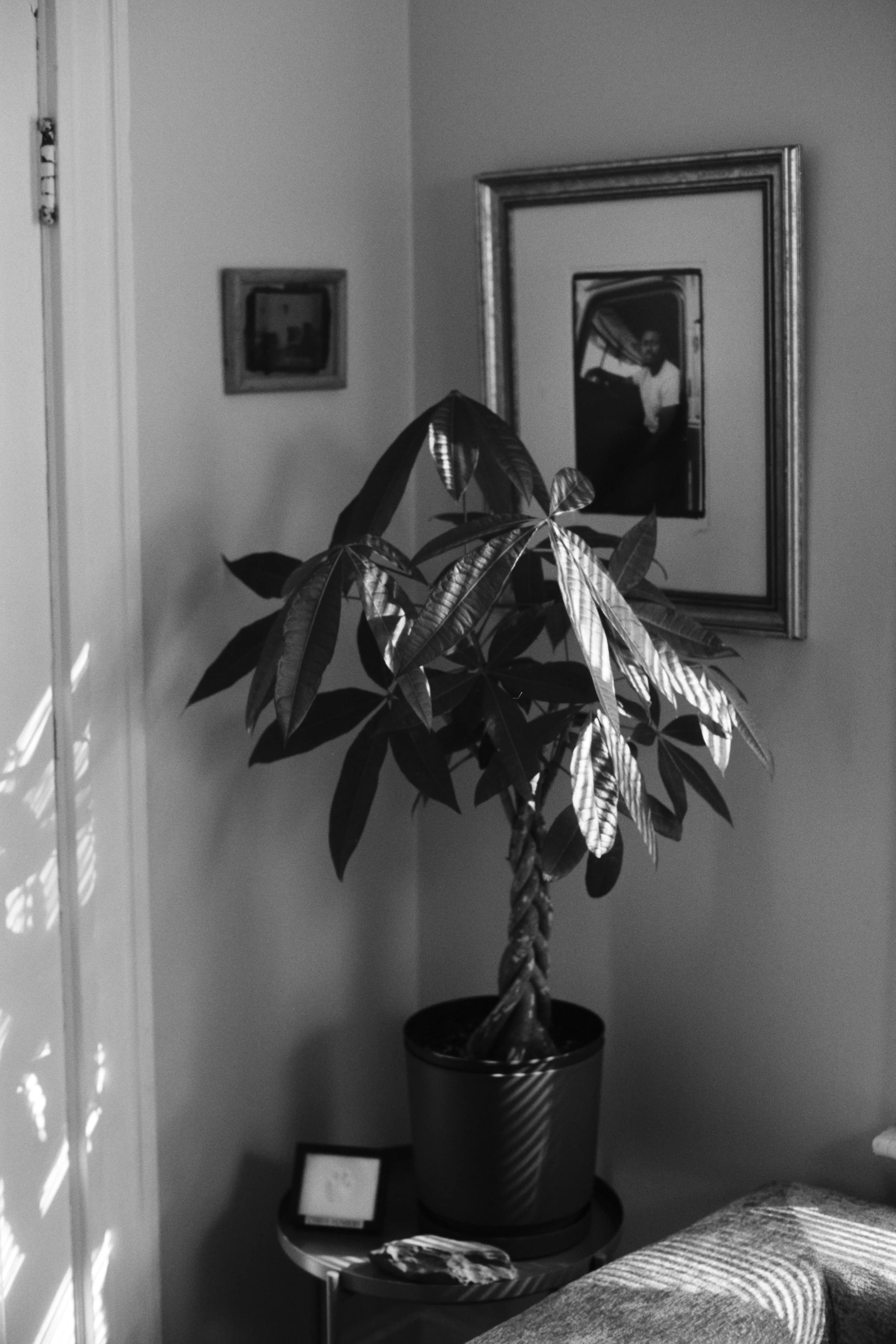 We stopped for a rest at home. The dog gets tired in this heat. My money tree has grown substantially, and she almost obscures my portrait of CJ. Beside her sits a stone I cleaned from our local park and the print of our beloved Cyrus.